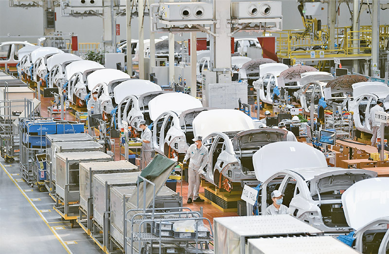 2023年4月12日,习近平总书记来到广汽埃安新能源汽车股份有限公司考察。他走进企业展厅、总装车间、电池生产车间等,了解企业突破关键核心技术和推动制造业高端化、智能化、绿色化等进展情况。图为广汽埃安新能源汽车股份有限公司总装生产线。 新华社记者 邓华/摄