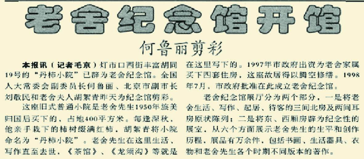 1999年,“人民艺术家”老舍先生诞辰百周年之际,位于灯市口西街丰富胡同19号的老舍故居建成老舍纪念馆,对外开放。这个小院是老舍先生1950年旅美归国后买下的,占地400平方米。每逢深秋,他亲手栽下的柿树缀满红柿,夫人胡絜青将小院命名为“丹柿小院”。老舍先生在这里生活、写作直至去世,《茶馆》《龙须沟》等作品就是在这里写下的。1997年,北京市政府帮助老舍家属解决了住房问题,老舍家属将这处房产以及老舍先生的作品、书信、日记、藏书等捐献给了国家。