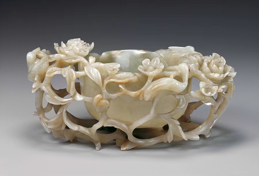 杯体为莲荷形,外壁布满镂雕的牡丹花枝和鹭鸶纹,设计巧妙,雕琢精致。鹭鸶常与莲荷芦草等组图,意为“一路连科”,牡丹则象征富贵荣华。