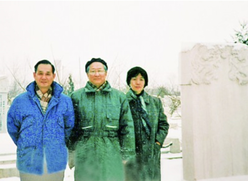 1991年12月10日,何康与吴韶成(左)、吴兰成(右)于吴石墓碑旁 图片来源:作者供图