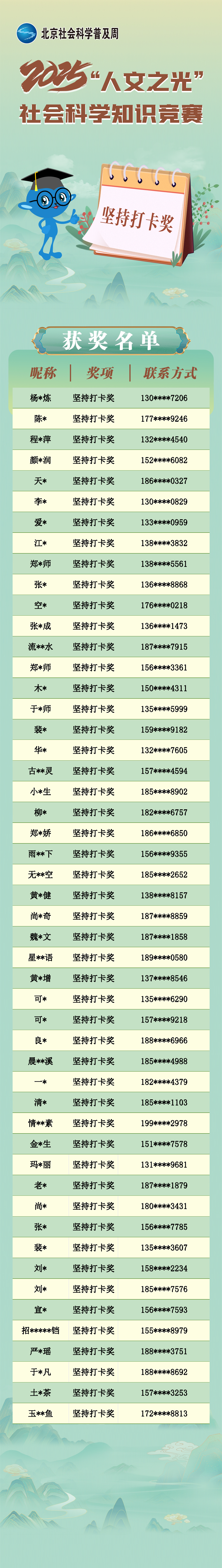 9月11日,由北京市社会科学界联合会、北京市哲学社会科学规划办公室举办的“2025‘人文之光’社会科学知识竞赛”圆满收官。本次竞赛历时15天,累计答题24万人次,奖项设置一等奖10个、二等奖20个,三等奖30个,坚持打卡奖50个。